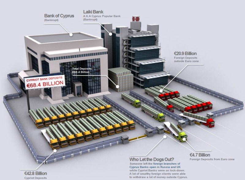 Bankovní krizi na Kypru zpracoval web Demonocracy názorně - pomocí kamionů plných peněz.