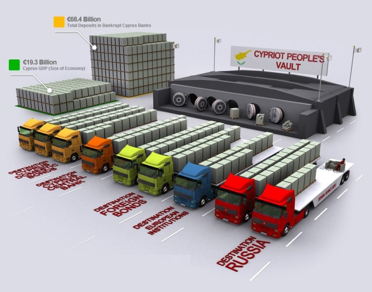 Více než 34 kamionů plných stovkových eurobankovek - odpovídajících 68,4 miliardám eur vkladů v kyperských bankách - se ve chvíli problémů Bank of Cyprus a Laiki Bank ukázalo jako přílišná nálož.